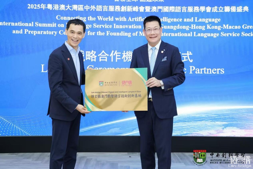 会议期间,语言桥集团与中西创新学院正式签署战略合作协议,标志着双方在数智语言服务领域正式开启了深度合作的新篇章。同时,凭借在语言技术与创新应用方面的领先实力,并获授“语言桥澳门数智语言技术创新基地”牌匾,标志着双方在数智语言服务领域开启深度合作新篇章。